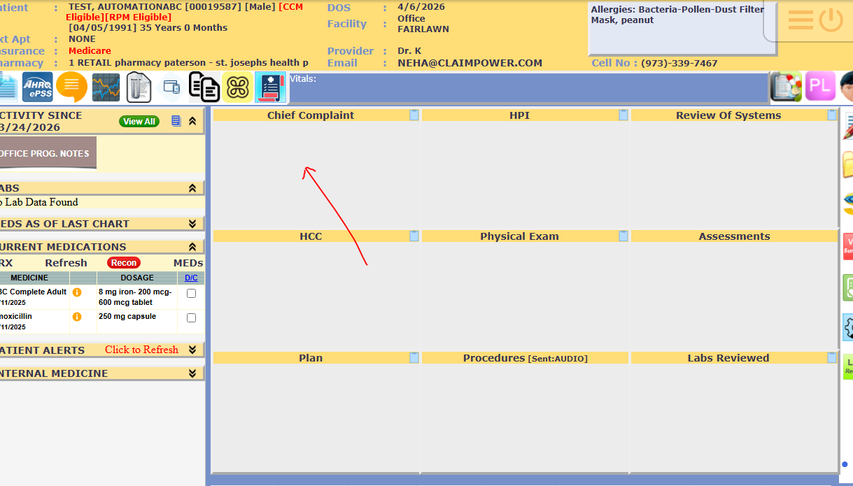 1st Step – On the charting screen, click on Chief Complaint as shown in below image: