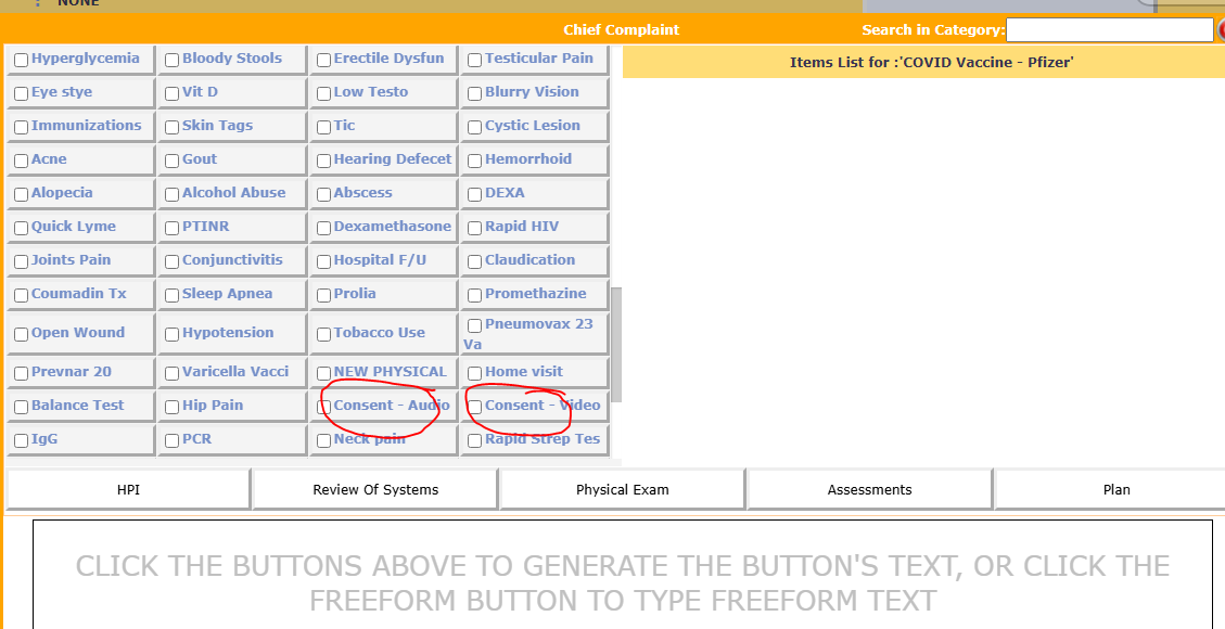 To align medical records with these payer rules, Claimpower updated the templates in two ways. First, the Chief Complaint section now includes additional telehealth buttons with dummy codes for Consent – Audio Only and Consent – Audio and Video. Second, once the provider selects the correct telehealth chief complaint and E/M visit, the system automatically applies the appropriate modifier during claim submission. This reduces provider’s workload and helps ensure the claim matches the selected visit type.