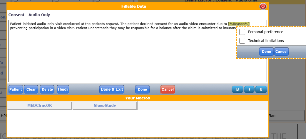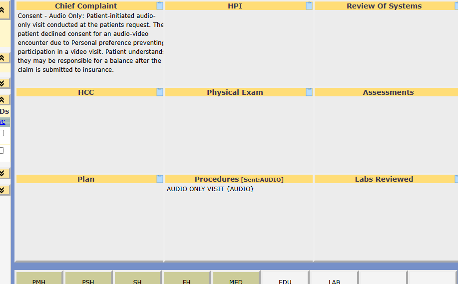 Once we hit DONE, there will be a procedure on the charting screen with the template. This will help Claimpower bill the appropriate telehealth codes with the correct modifier, indicating whether the visit was conducted via audio or video.